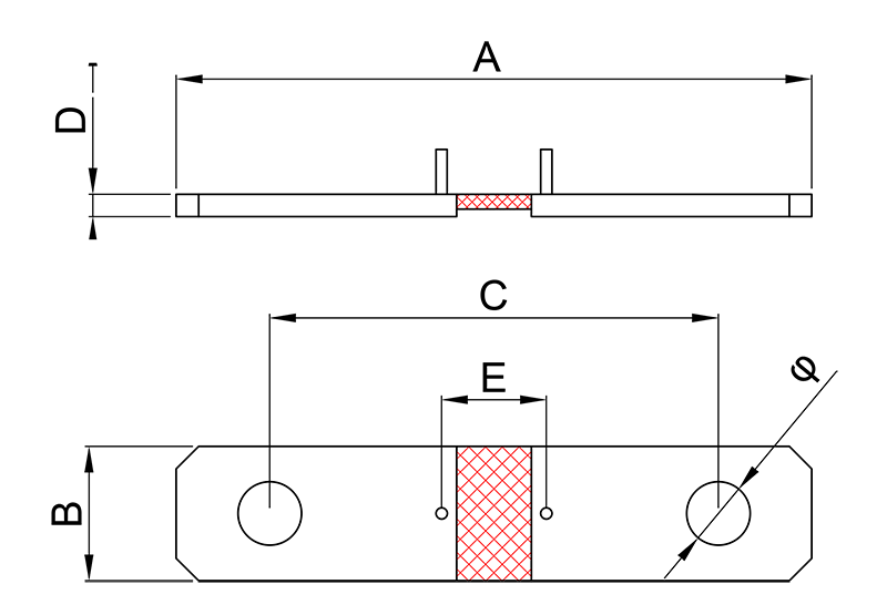 | 类型 | A(mm) | B(mm) | C(mm) | D(mm) | E(mm) | φ(mm) | 阻值(μΩ) | 精度 |